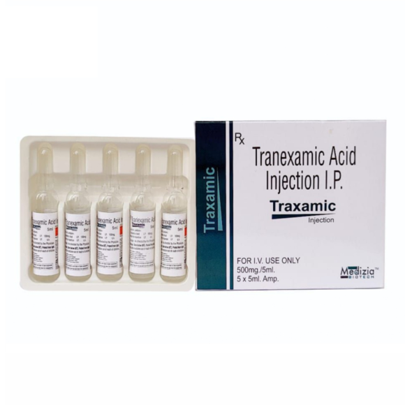 TRAXAMIC 5ml is a sterile injectable solution of Tranexamic Acid, an antifibrinolytic agent used to control and prevent excessive bleeding. It works by inhibiting the breakdown of blood clots (fibrinolysis), making it ideal for surgical procedures, trauma, menorrhagia, and other conditions where blood conservation is critical.